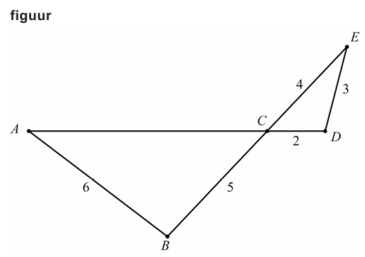 Gegeven is driehoek met en . Verder is gegeven driehoek met , en . Punt is het snijpunt van lijnstuk en lijnstuk . Zie de figuur. Zijde is de enige zijde waarvan de lengte onbekend is.