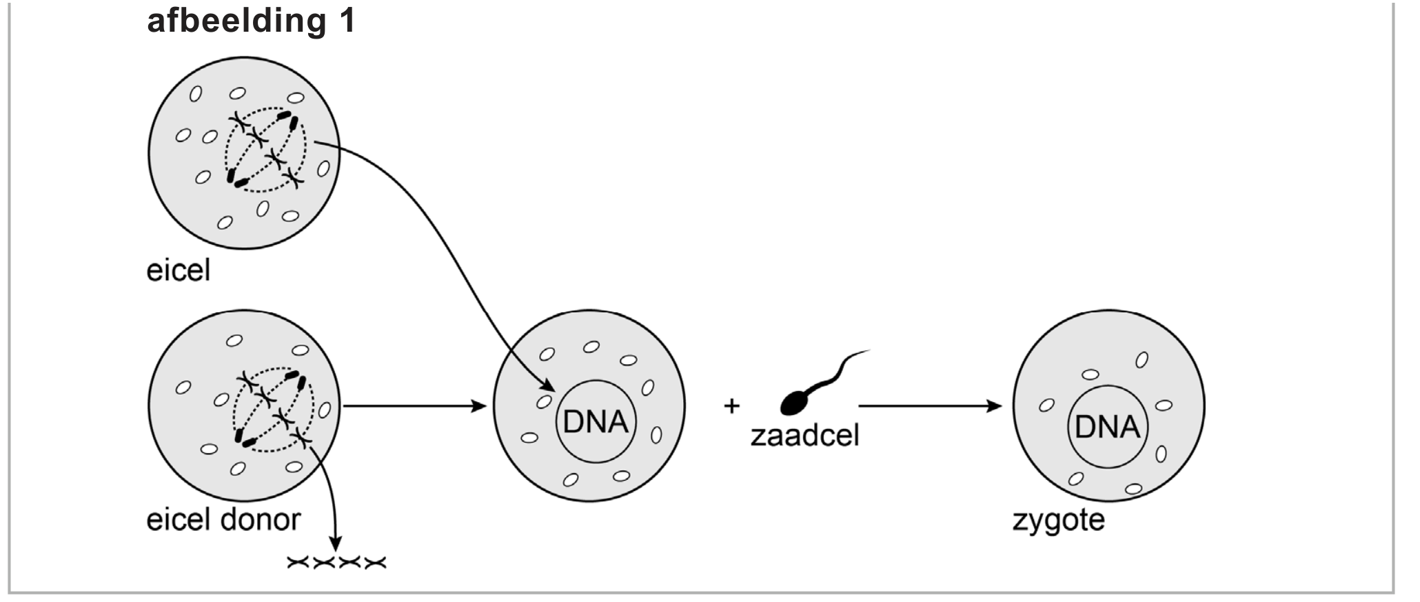 Bij MST wordt het kern-DNA van een eicel van de moeder samengevoegd met een kernloze eicel van een donor met normale mitochondria. Beide eicellen verkeren tijdens de overdracht van DNA in de laatste fase van de meiose. De hieruit geconstrueerde eicel wordt vervolgens kunstmatig bevrucht door een spermacel van de vader (afbeelding 1).