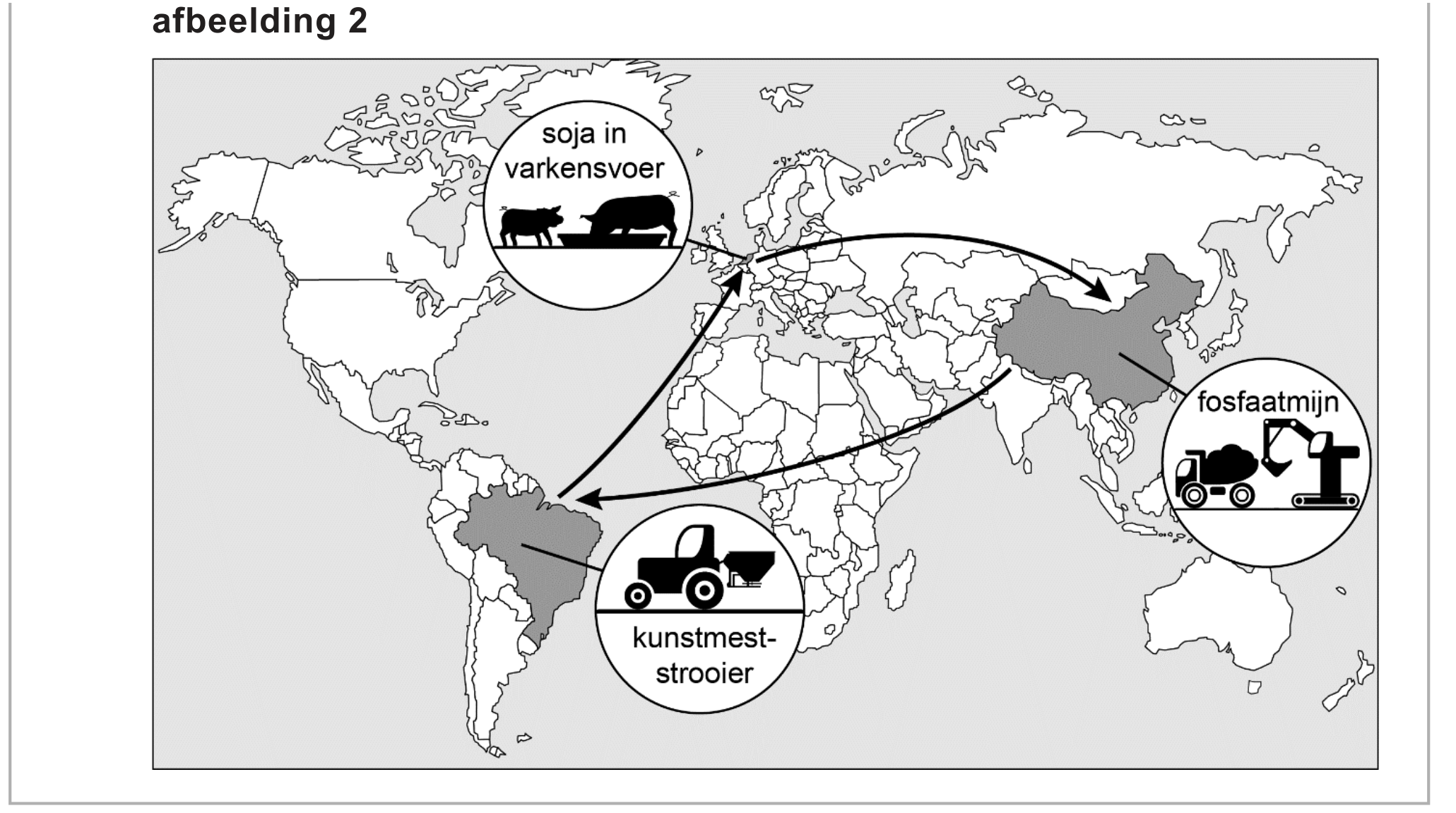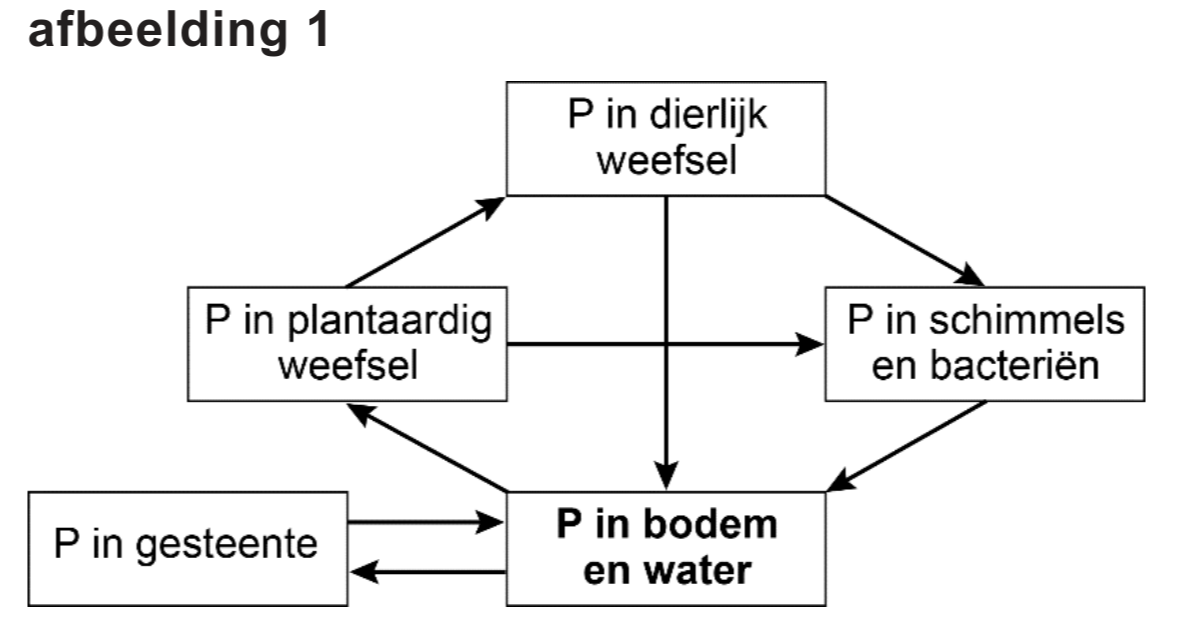 Het element fosfor (P) komt vrij bij verwering van gesteente en wordt gewonnen in fosfaatmijnen. Fosfor kan in de vorm van fosfaat door planten worden opgenomen. Een deel van de fosforverbindingen die in het water terechtkomen, slaat neer en kan op de lange termijn weer onderdeel worden van gesteente. In afbeelding 1 is de fosforkringloop vereenvoudigd weergegeven.