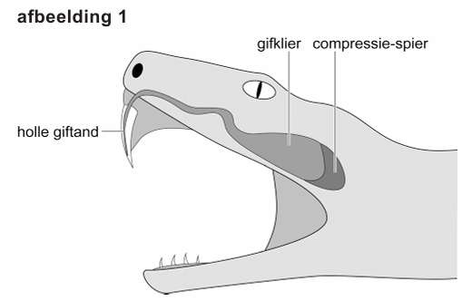Gifklieren van slangen zijn aangepaste speekselklieren. Slangengif bevat een mix van verschillende eiwitten die een prooi kunnen verlammen en verteren. Als een slang bijt, trekt de compressie-spier rond de gifklier samen, waardoor het gif via een afvoerbuisje door de giftand (afbeelding 1) in de prooi terechtkomt.