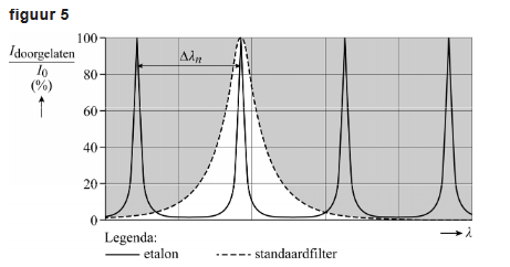 De breedte die de doorlaatcurve van het tweede filter maximaal mag hebben, hangt af van de onderlinge afstand tussen de pieken, Δλn, in de doorlaatcurve van het etalon.