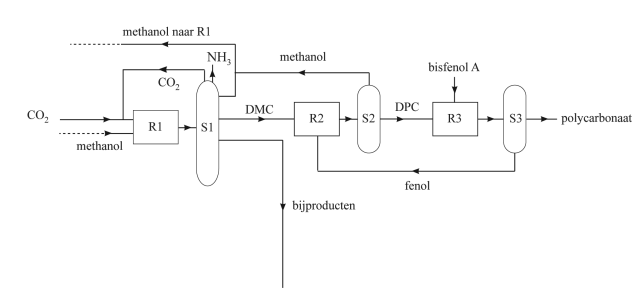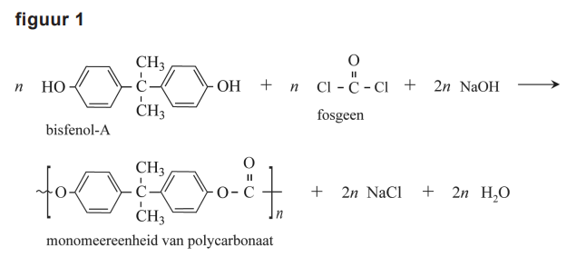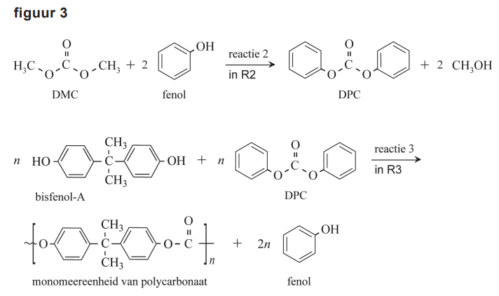 De totaalvergelijking van alle reacties in dit productieproces van polycarbonaat is in figuur 1 vereenvoudigd weergegeven.