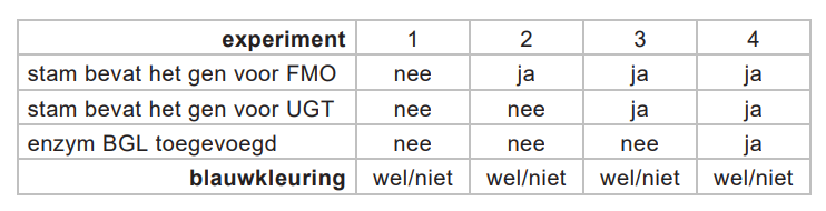 In figuur 3 is de vorming van indigo in de plant schematisch weergegeven. Drie betrokken enzymen zijn met de afkortingen FMO, UGT en BGL aangegeven. In het blad van de indigoplant wordt indool door het enzym FMO omgezet tot indoxyl. In aanwezigheid van het enzym UGT wordt indoxyl vervolgens geheel omgezet tot indicaan. Het gevormde indicaan wordt opgeslagen. Bij beschadiging van de bladeren komt het enzym BGL vrij dat indicaan omzet tot indoxyl, waaruit vervolgens indigo ontstaat. Het enzym UGT bevindt zich op een andere plaats in de cel, waardoor UGT het gevormde indoxyl in deze situatie niet kan omzetten. De onderzoekers kweekten enkele stammen van E. coli. In deze stammen waren wel of niet genen van de indigoplant overgebracht. In de tabel op de uitwerkbijlage is te zien welke experimenten zijn uitgevoerd. Bij elk experiment bevatte de voeding glucose en tryptofaan. Tryptofaan wordt door E. coli van nature omgezet tot indool. De bacteriën hebben geen genen voor de aanmaak van het enzym BGL. Om toch blauwkleuring mogelijk te maken, werd aan sommige bacteriekweken het enzym BGL toegevoegd.