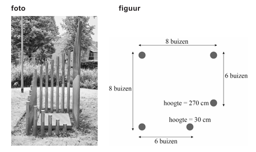 Het monument bestaat uit een gedenksteen omringd door metalen buizen die met cement gevuld zijn. Deze opgave gaat over die buizen. In de figuur staat een bovenaanzicht van het monument, met een aantal van deze buizen. Hierin is te zien dat de buizen op de rand van een vierkant staan, waarbij er bij het hoekpunt rechtsonder (op de foto rechtsvoor) een kleine opening is, omdat daar geen buizen zijn geplaatst.