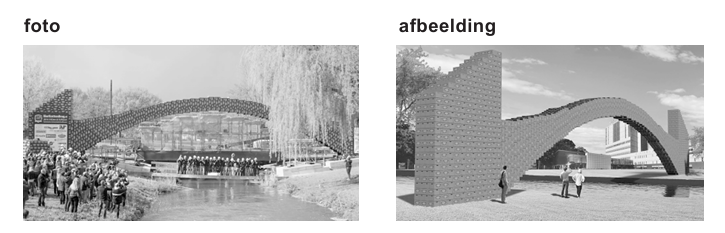 Studenten van de Technische Universiteit Eindhoven hebben in 2016 een brug van kratten gebouwd. Zie de foto. Naast de foto zie je ook een afbeelding van een computeranimatie uit de ontwerpfase van de krattenbrug.